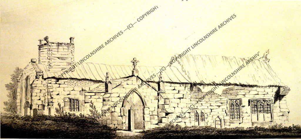 Nattes drawing of Haltham church in 1799 – the cross stump is directly in front of the doorway